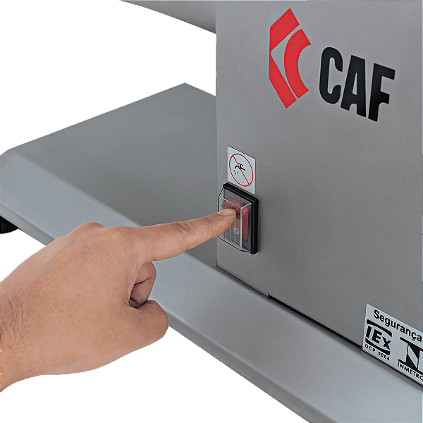 Capa protetora em aço inox com sistema de segurança que impede o acesso dos membros superiores aos rolos quando o equipamento está ligado.